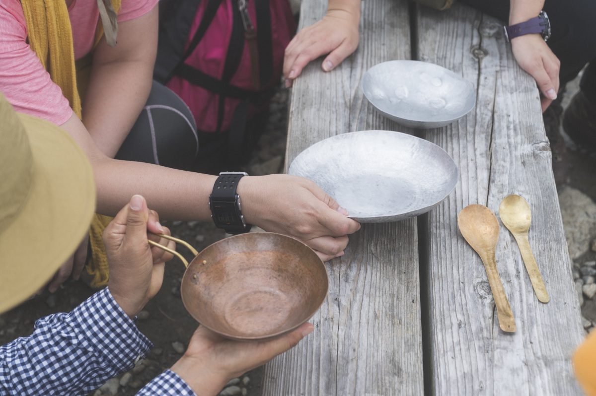 一つひとつていねいに、鍛金技法で叩き作り上げられたアイテムは、とても繊細で、力強さも感じられる。「山並みボウル」と呼ばれるアルミ素材のお皿の内側には、タガネを使って手打ちされた山並みが描かれている、まさに山を愛する人の心に響くアイテムだ。