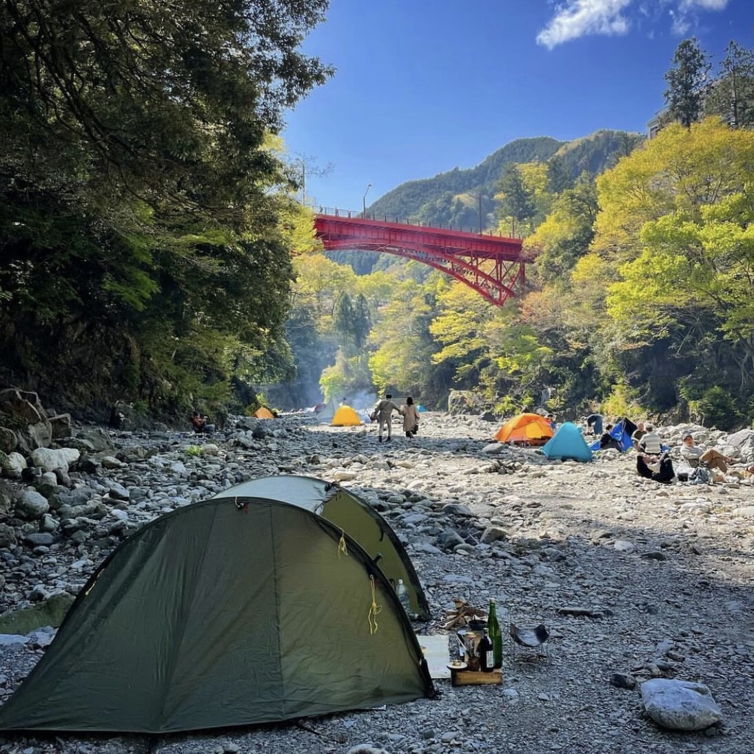 神奈川県、表丹沢の川沿いに点在するキャンプ場。都心からバスや電車を使って1時間で行けるので、車がない方でも気軽にキャンプを楽しめます。