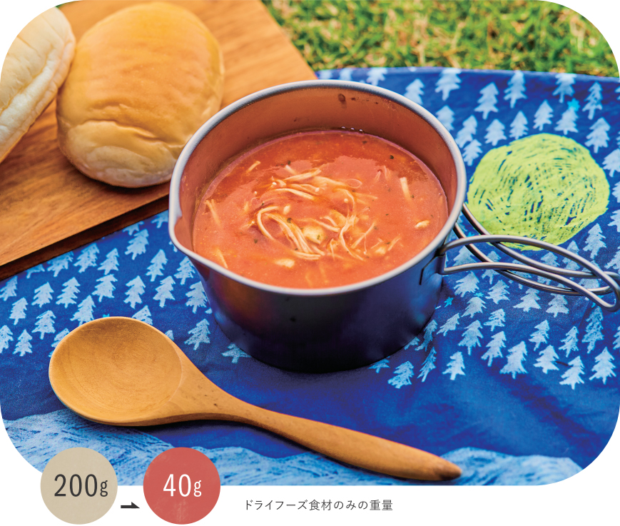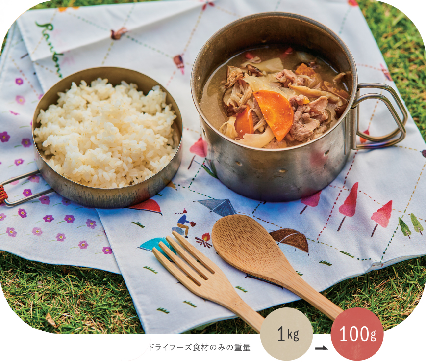 「テント泊山行の悩みどころは、軽量化。テントやスリーピングバッグなどの装備が増えて重たくなります。また、テントを張ったりと、身の回りに手がかかるため、食事も簡素になりがちです。けれど、それでは残念。せっかくのテント泊のご飯だから、おいしいものが食べられたら楽しいですよね。また長期縦走になると、栄養にも気を配りたいので、市販の乾燥食品やインスタント食品だけでは頼りないし、飽きてしまいます。