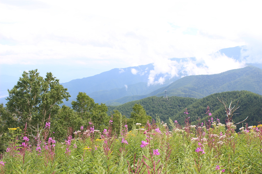 途中の松ノ木平を越え、カラマツや笹に囲まれた歩きやすい山道を1時間ほど楽しむと山頂です。今回登った初夏の季節は、ピンクや黄色、白や青など、さまざまな色の花で溢れ、その先には伊那谷の街と南アルプスの山々が広がっています。さらに、来た道を振り返ると間近に木曽駒ヶ岳が。天気の良い日には木々の間から御嶽山、乗鞍岳も望むことができます。