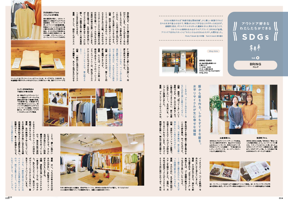 ▲未来の世代に豊かな自然を残すため何ができるのか?「アウトドア好きなわたしたちができるSDGs」が連載になりました。第一回はリサイクルを生み出すウエアブランド「BRING」が登場。服から服を生み出す仕組み、環境と服への思いを伝えています。