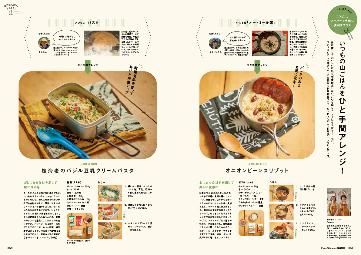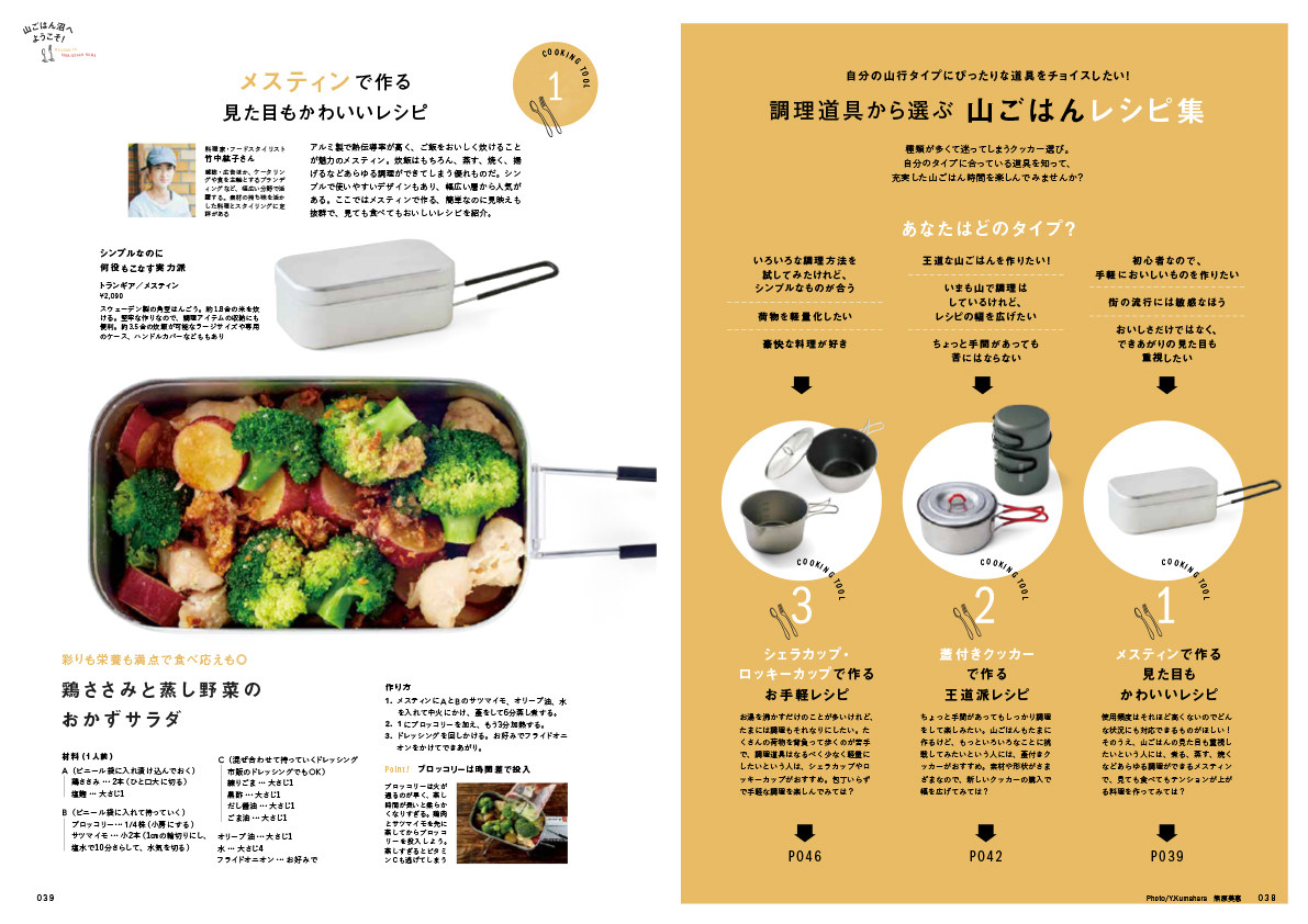 ▲山ごはんを作るときに使う調理道具をタイプ別に紹介。見た目重視、お手軽重視、山ごはんメイン派など、自分に合った調理道具がわかります。さらに料理家さんが調理道具を生かしたレシピを紹介しています。