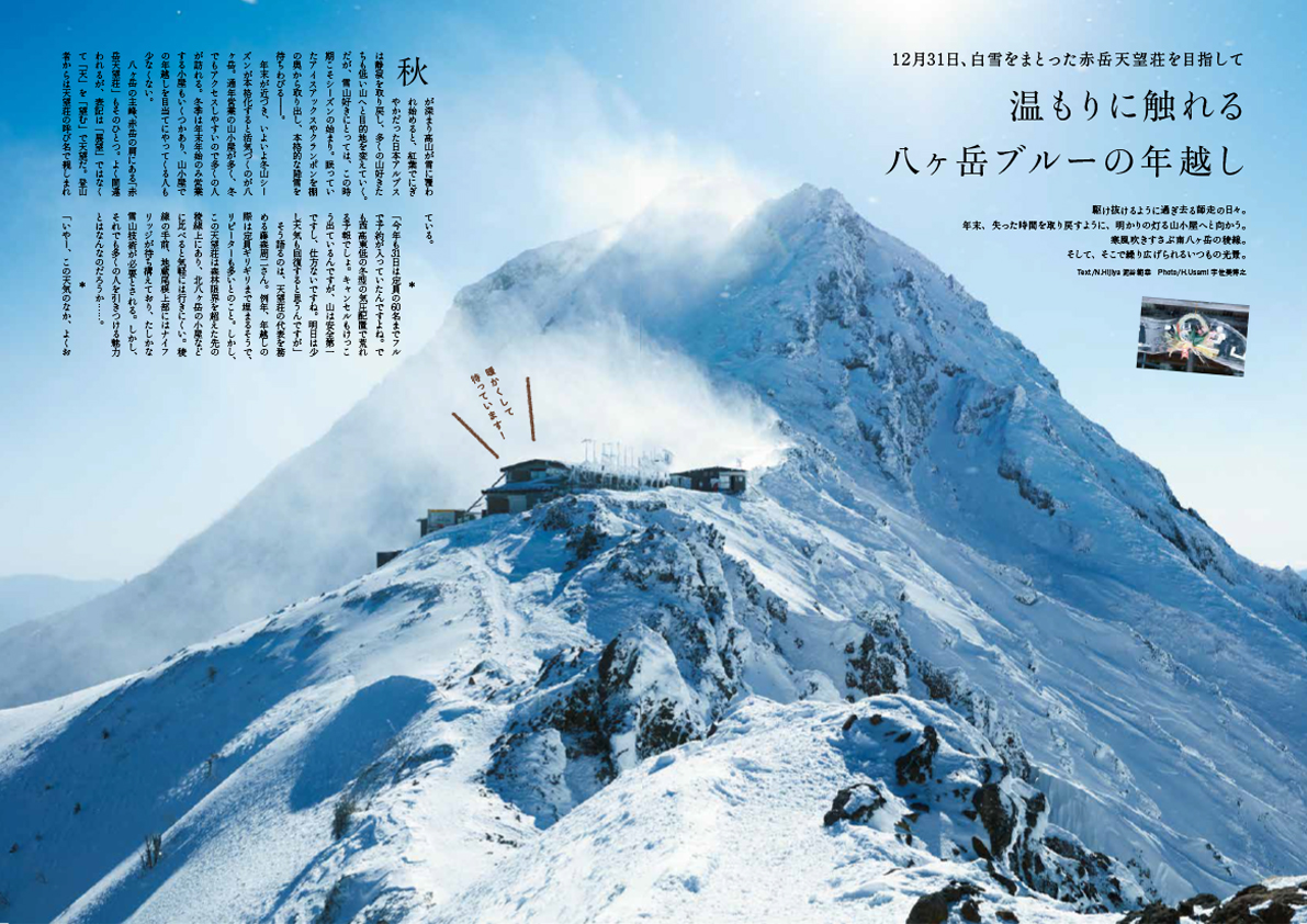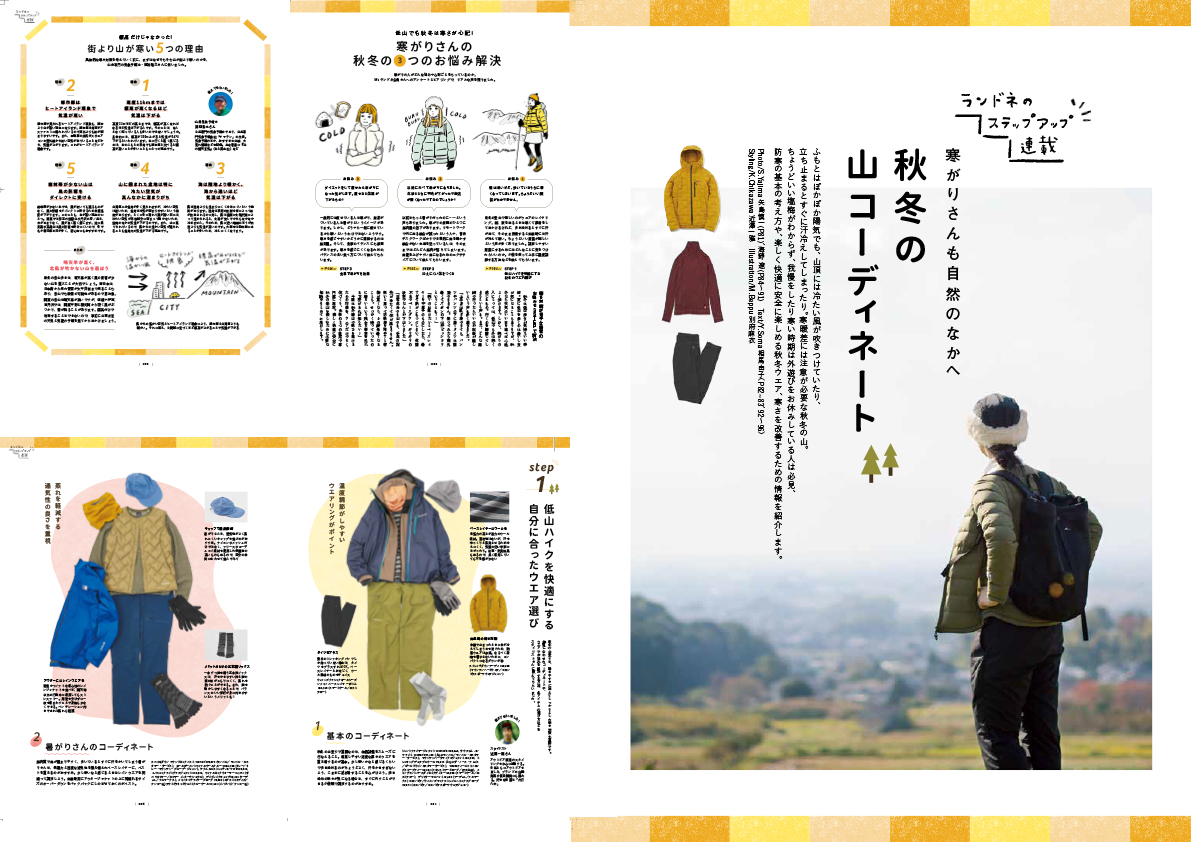 ▲第二特集は寒さ解決です。歩いているときは汗ばみ、低山でも山頂の気温は低いため立ち止まると汗冷えをしてしまったり、秋冬の山歩きは寒暖差があり、体温調整に気をつかう季節です。ウエアのコーディネートのほか、冷えにくい体づくり、身体を冷やさない食など冬のアウトドア快適に楽しく過ごせる方法を紹介しています。