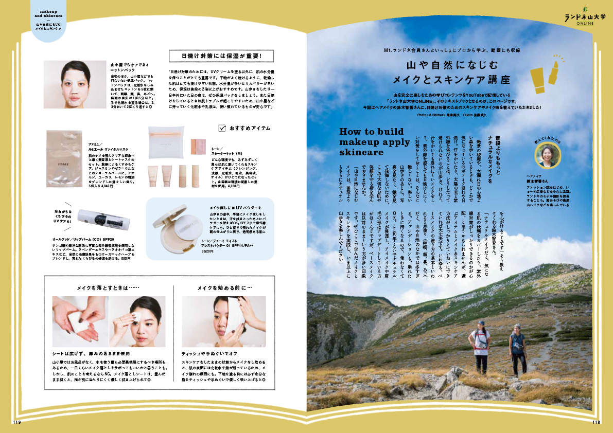 ▲2カ月に1回開催している「ランドネ山大学」のテキストブック。今月はヘアメイクの鈴木智香さんに、日焼け対策のためのスキンケアやメイク術を教えていただきました! このページを参考にしながら、11月28日21:00から配信のランドネ山大学オンラインもお見逃しなく!