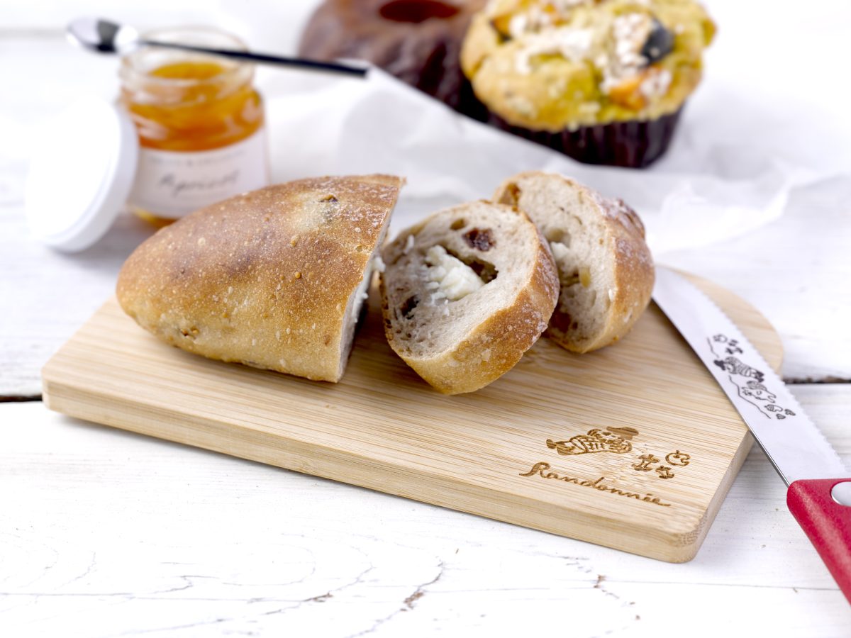 ▲今月の付録は、まな板にもお皿にもなる「山並みカッティングボード」。ランドネのマスコットキャラクター、アルプスのおやじムッシュがお腹いっぱいになって寝転んでいる刻印をしました。アウトドアでも家でのちょっとした調理でもたくさん使ってもらいたいです。