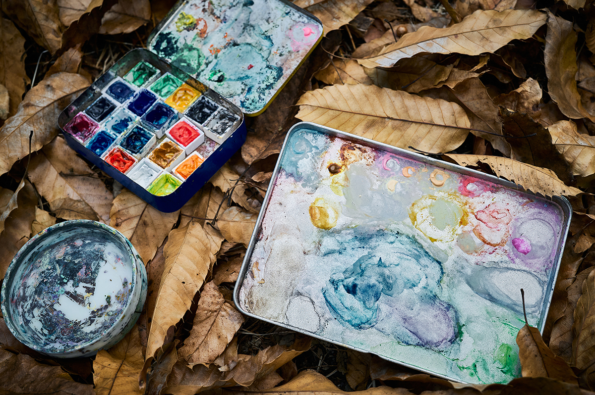 伊藤さんはラゲッジスペースから画材を取り出す。画板に筆、スケッチブック、パレット、そして大量の絵の具。どれも使い込まれていい味がでている。