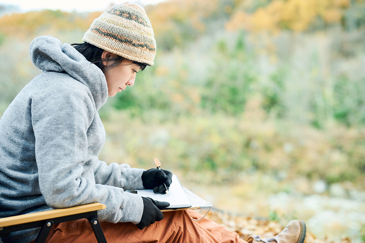 川の畔に腰かけて、目を輝かせてペンを動かす伊藤さん。
