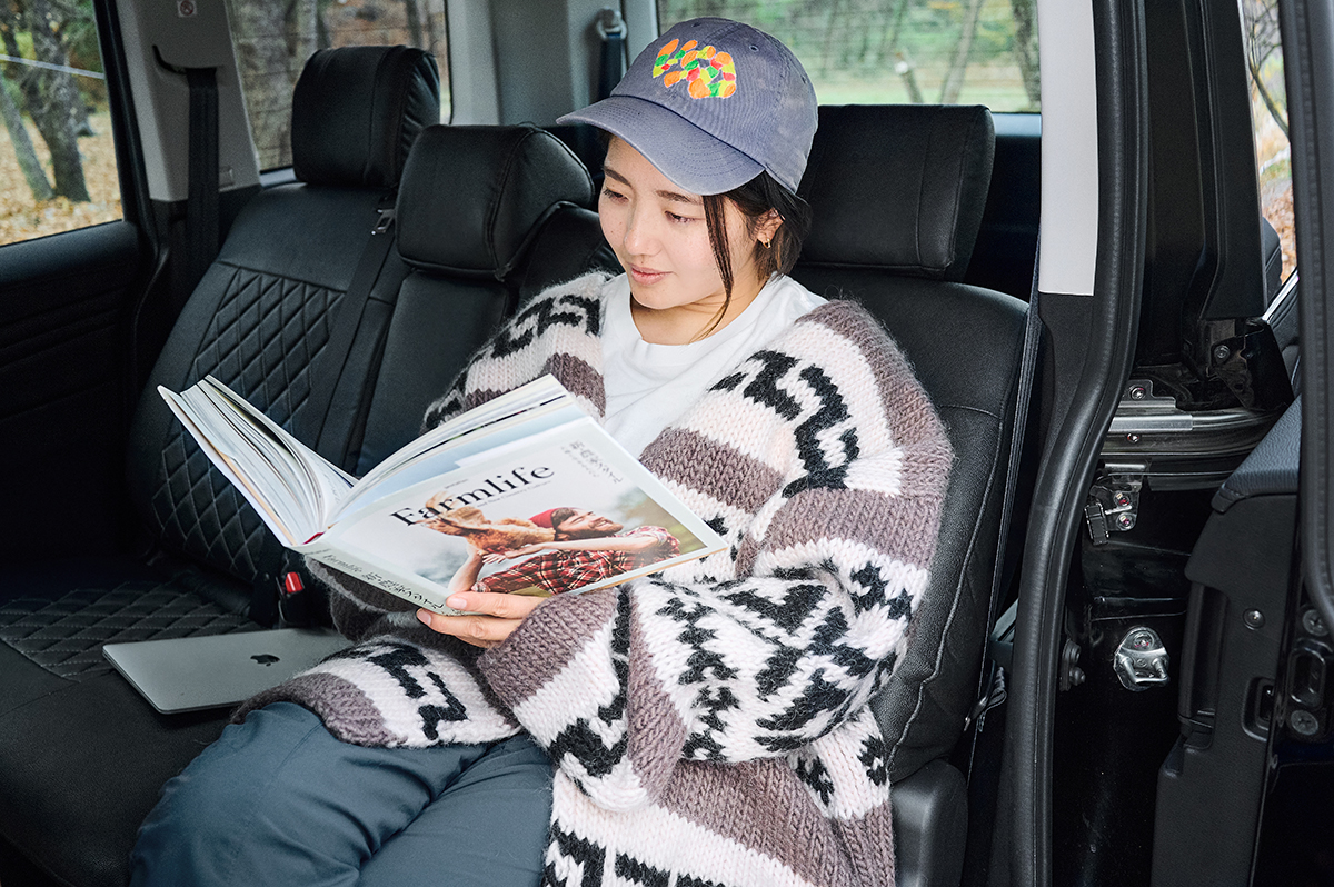 「キャンプであまり忙しくするのは好みじゃなくて。リラックスする時間として使いたいんです」と、黒澤さんは後部座席で読書をはじめる。