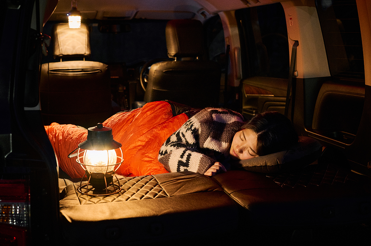 「座面を倒してもクッションが効いているので、マットも必要ないです。それに後部座席をフラットにしたときに、三列目だけちょっと高いんですね。これなら頭を高くして眠れるし、フルフラットじゃないところが逆に快適です」