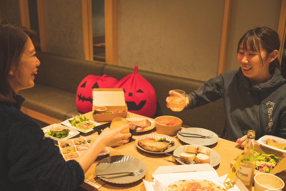 とても楽しみにしていたディナータイム。少し照明が落とされ落ち着いた雰囲気になった、BEBのパブリックスペースTAMARIBAにてテイクアウトしたイタリアンをいただきました。高原リゾートならではの野菜をたっぷりと使った料理は、色とりどりで華やかで、さまざまな味わいがありとてもおいしかったです。食べたらすぐに部屋に戻れる、リラックスしたディナーとなりました。