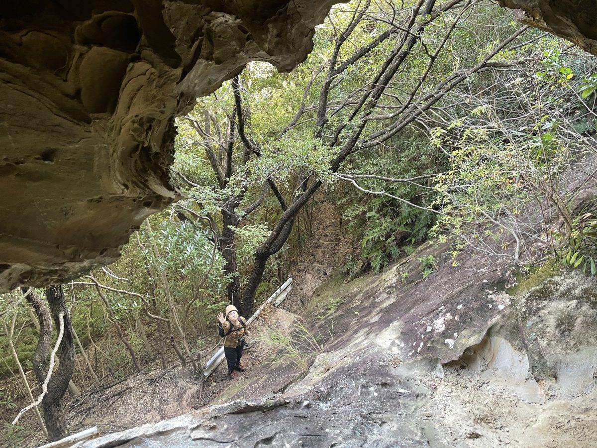奇絶峡からの不動の滝、巨大な一枚岩に刻まれた磨崖三尊大石仏を眺めたら、高尾山(標高606m)への登りがスタート。温暖な海辺の町ならではのシダが茂る道は、「けっこうしんどいよ」と聞いていただけあり、なかなかの急坂。