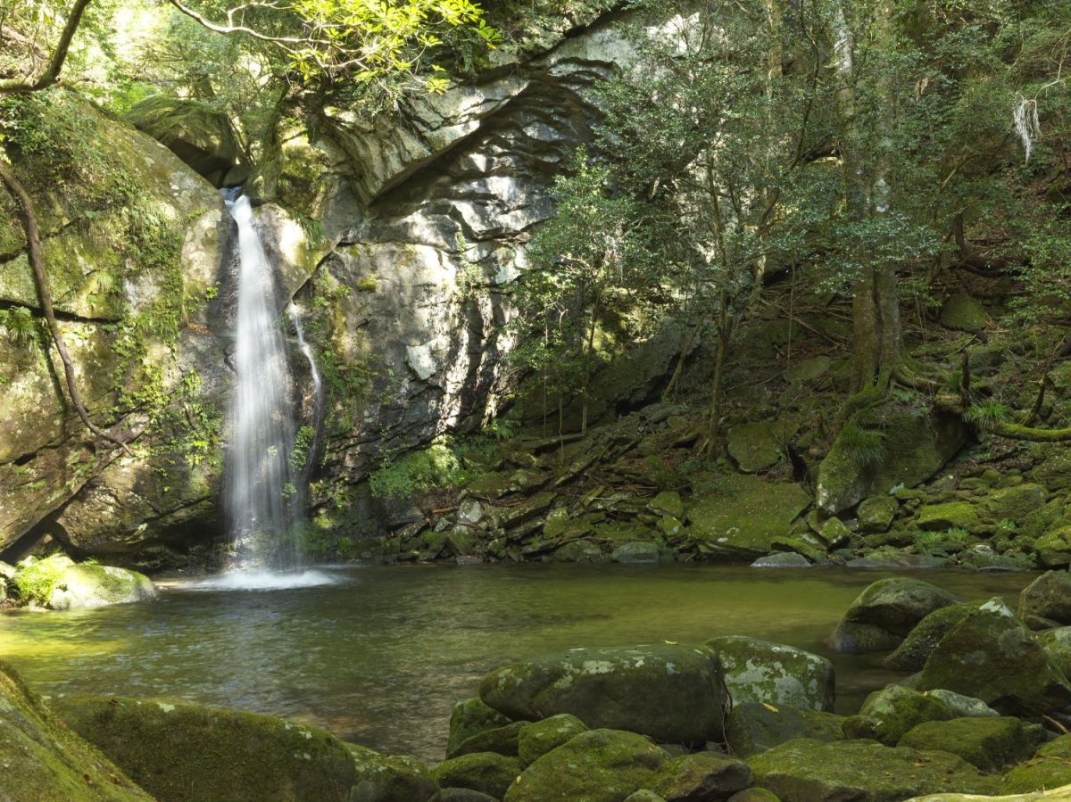 今回のゴールは、落差約30ⅿの「犬落ちの滝」。滝の間には岩が挟まり、落ちそうで落ちない。長い歳月をかけて水研ぎされ、岩が輝いていた。