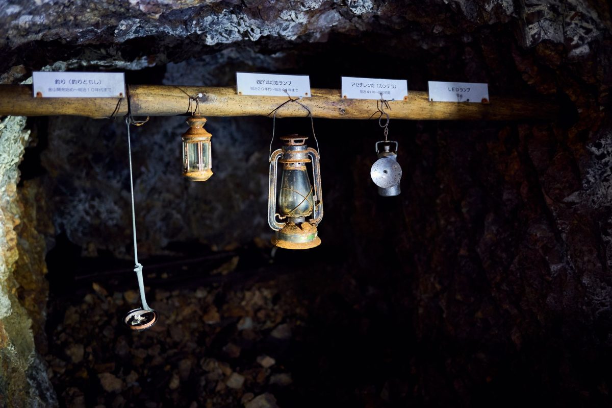 真っ暗な坑道の中では、年代によってさまざまな灯りが使われていたという。金山開発始めから明治10年代までは、無名焼の器に油をひいて火を点けるスタイル。煙が充満する坑道内で働くため、肺を患い亡くなる人もいたそう。明治20年以降は、西洋式の灯油ランプ。明治41年からは、酸素を使わずに灯すことができるアセチレン灯(佐渡鉱山で作られたもの)が活躍。
