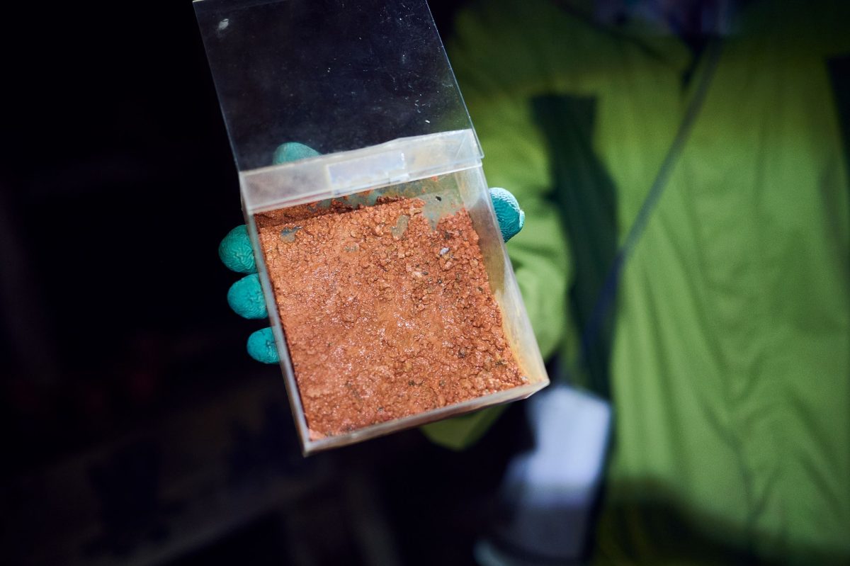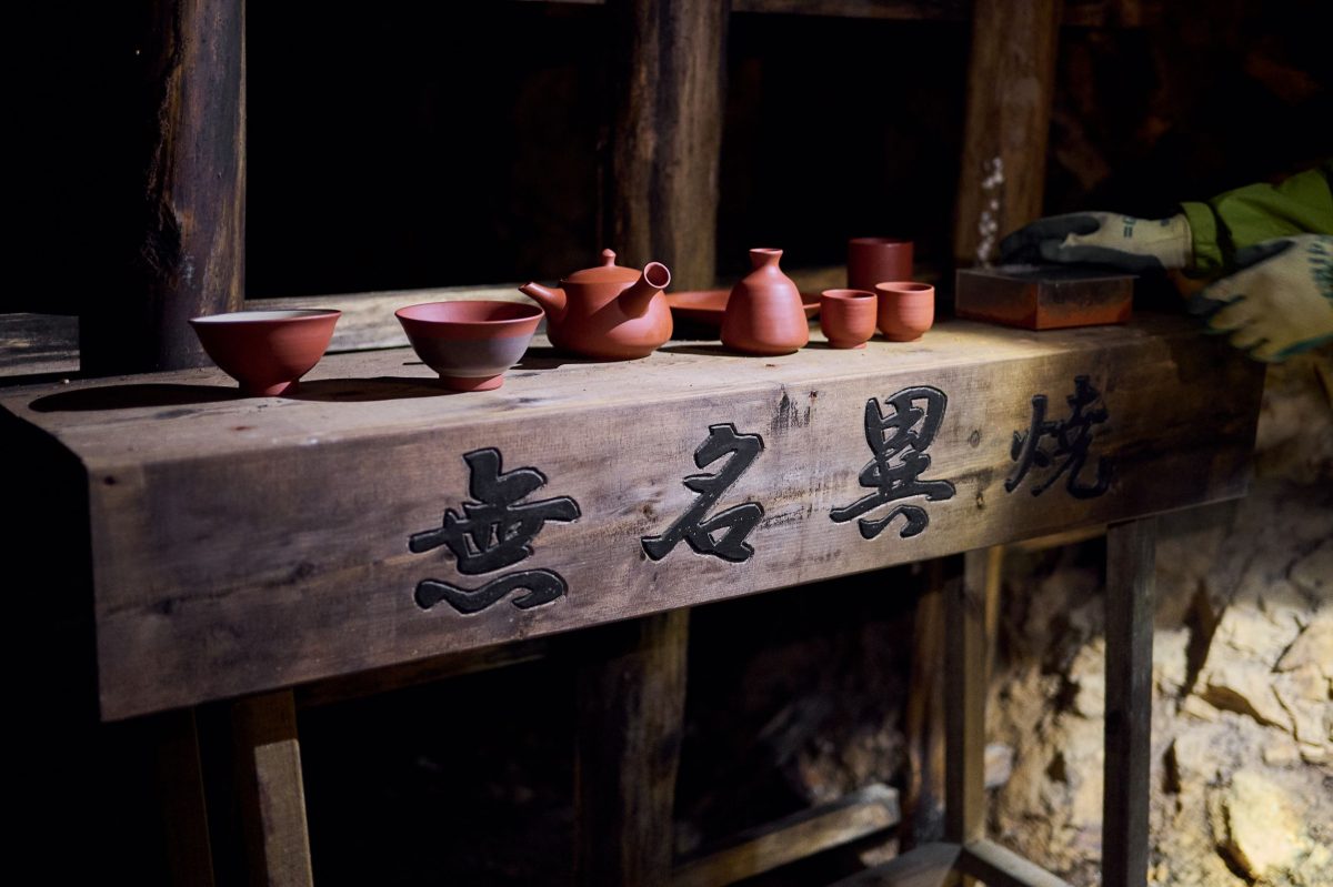 赤みがかった色が特徴の「無名異焼」の原料となる赤い岩石を採掘し、器を作っていた江戸時代。この土は、貧血や止血剤としても使われていたという。空気に触れ、酸化し赤くなるこの岩石は、断層の周りにしかできないと、戸田さん。無名異焼は非常に硬いのも特徴。