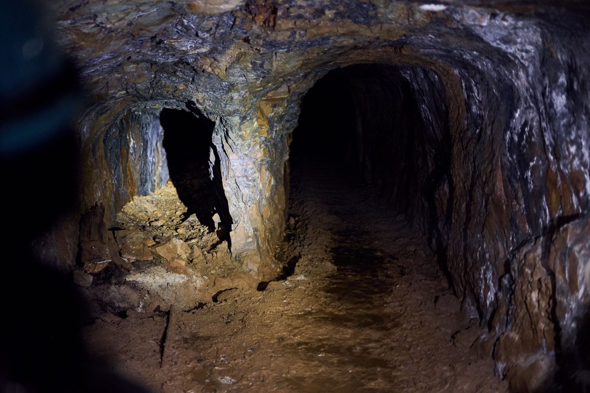 平行坑道の右側はトロッコが通れる幅に広げたもの。ふたつの坑道の幅は1m未満と、人力で掘らなければ不可能な幅だ。時代の境目をここで感じることができる。この先を進むと、大規模な採掘跡を見ることができ、トロッコ用レール跡も残っている。ツアーではここで灯りをすべて消して、暗闇体験なども。
