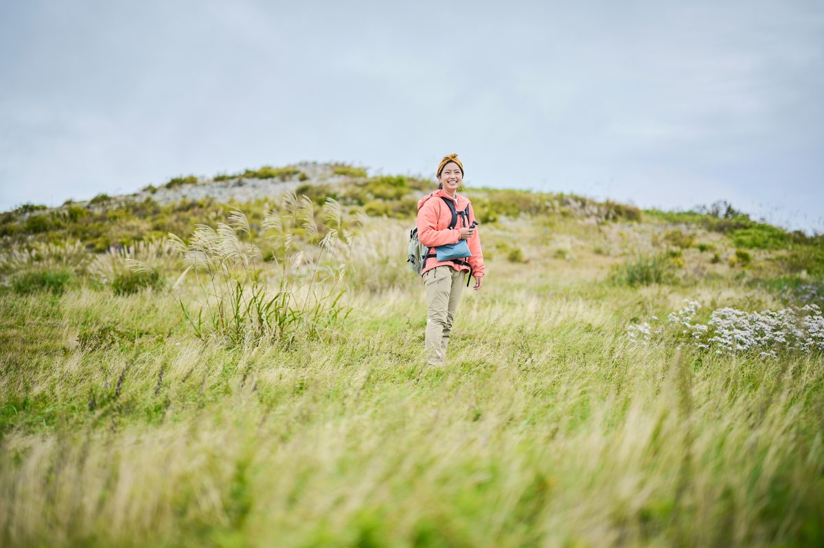 佐渡島には標高1,000m前後(島内で一番高い山は、金北山/標高1,171m)の山が連なり、日帰りから縦走登山まで、さまざまな歩き方と楽しみ方ができるもの魅力のひとつ。リファさんが今回歩いたのはドンデン高原にある、標高940mのドンデン尻立山。ドンデン山荘から片道45分ほどでたどり着ける、初心者でも安心のコース(片道約700m)。