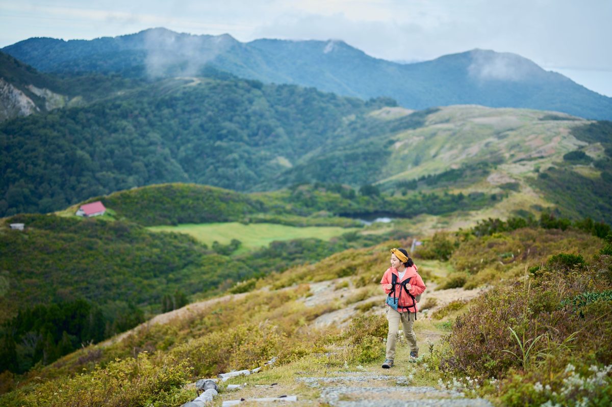 そして、2度目。たどり着いた山頂からは、その先の山まで道が続いていくようすが見渡せ、眼下には赤い屋根の小屋が見える。1時間でたどり着く景色とは思えない、深くて、広くて、美しすぎる風景にだれもがため息を漏らすはず。目線の先には、海が見える。本州側には、鳥海山や月山、朝日岳、飯豊連峰と東北を代表する名峰の姿があり、ここが30km以上離れた島であることを実感する。