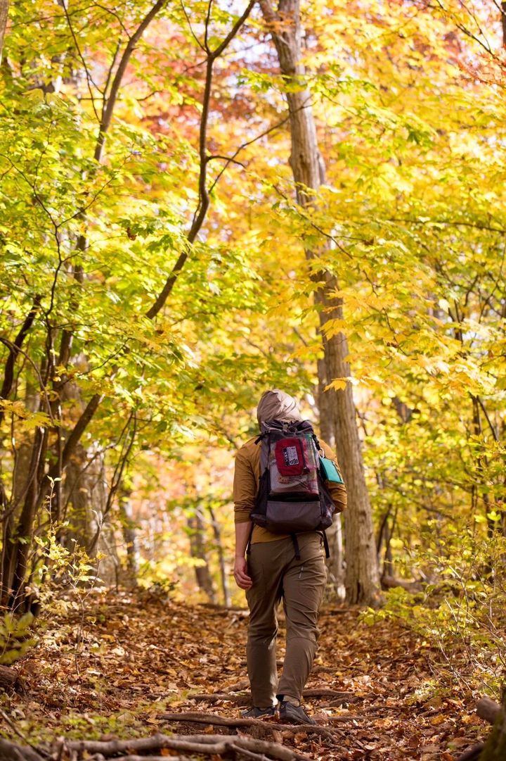 てぬぐいと帽子を組み合わせた「ほっかむりスタイル」で紫外線をカット。リュックの中に山上で着るウェアを忍ばせて、まずは軽めの服装で日差しを感じます。山麓の紅葉に溶け込むような黄色のシャツとカーキのパンツの組み合わせが、秋らしくて素敵ですね!