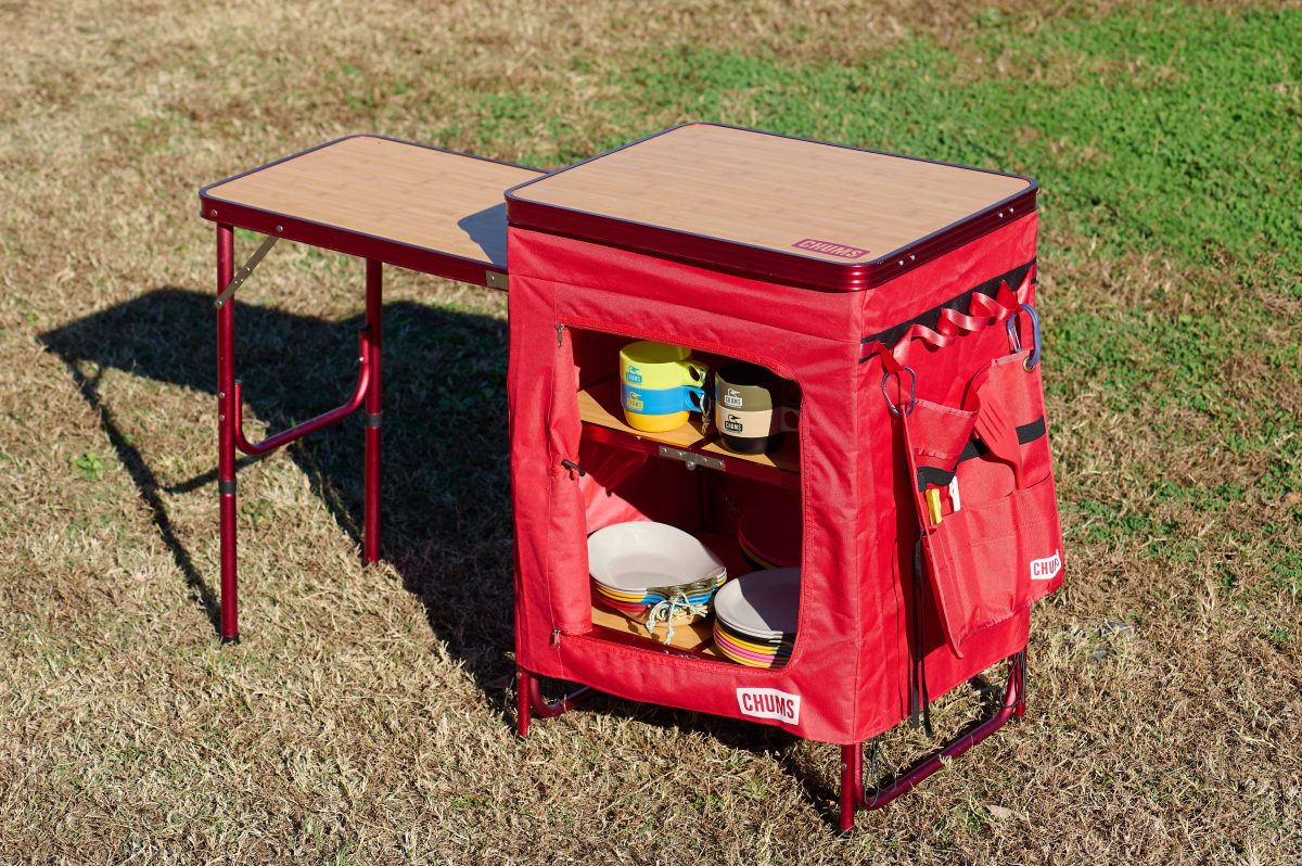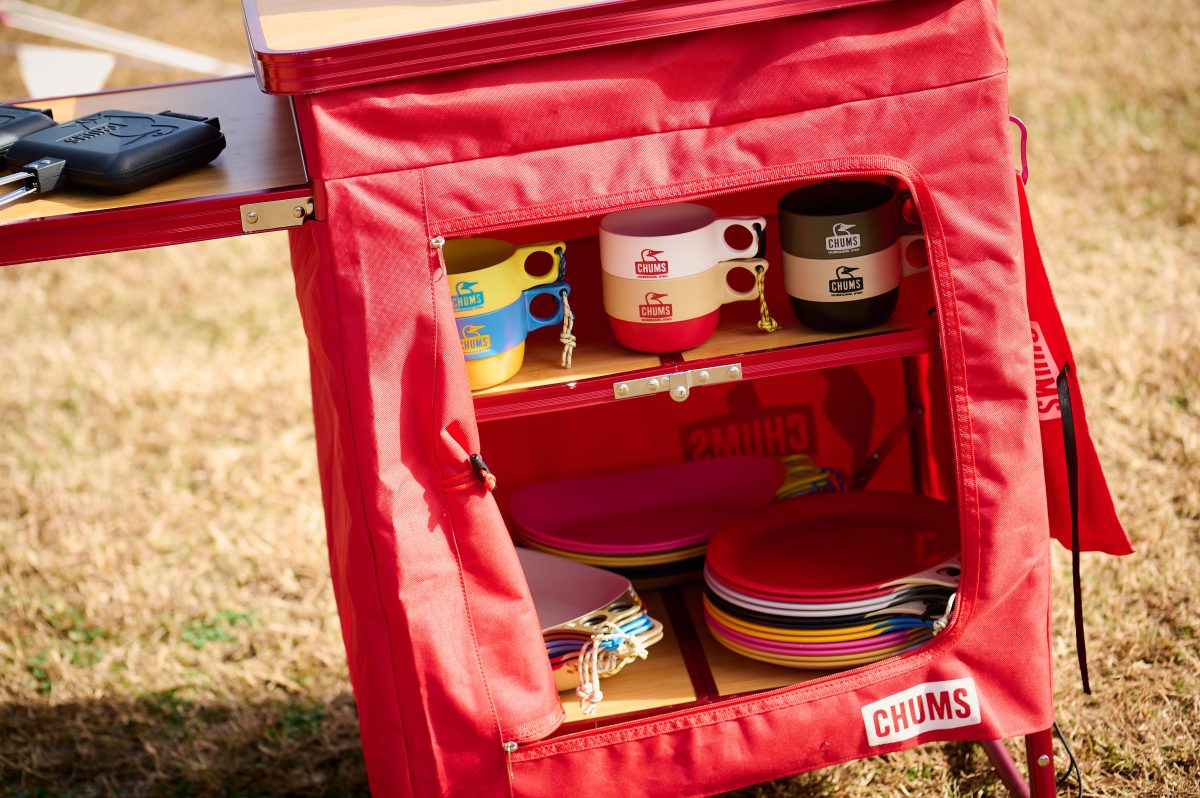 せっかくグループでキャンプに来ているなら、仲間といっしょにキャンプ料理を作りたいですよね。そんなとき、チャムスの「オーガナイザーテーブル」が大活躍! ファスナー付きのラックや、小物の吊り下げに便利なループテープが付いているので、それぞれが持ち寄った食器や調理器具をすっきりと収納できます。コンパクトに折り畳めるのも魅力です。