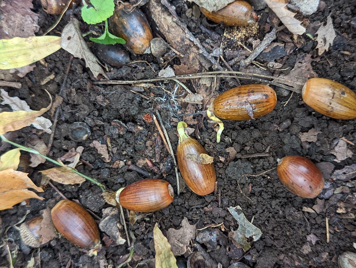 毎年、こんなにたくさんのどんぐりが落ちていて、木になれるのはそのほんの一部。多くのどんぐりは小動物の餌や森の肥料になります。
