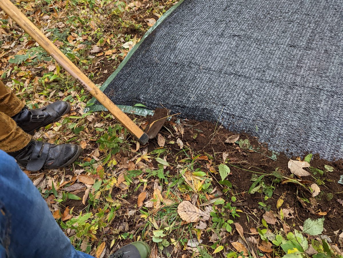 ネズミなど森に住む小動物が食べてしまわないようにシートをかけて、コの字の釘で各所をとめます。