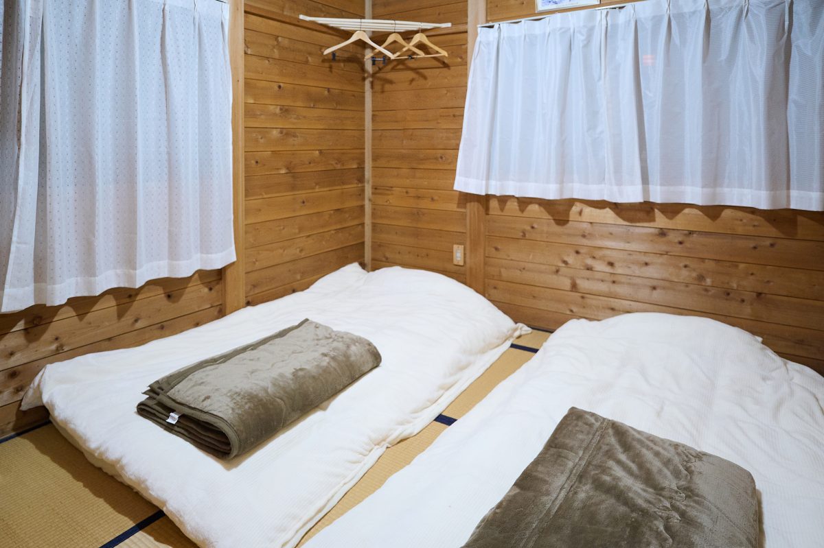 寝室は電気ストーブと十分すぎるほどのふかふかのお布団で、寒さとは無縁です。充電のためのコンセントやアメニティグッズ(*5)もあります。
