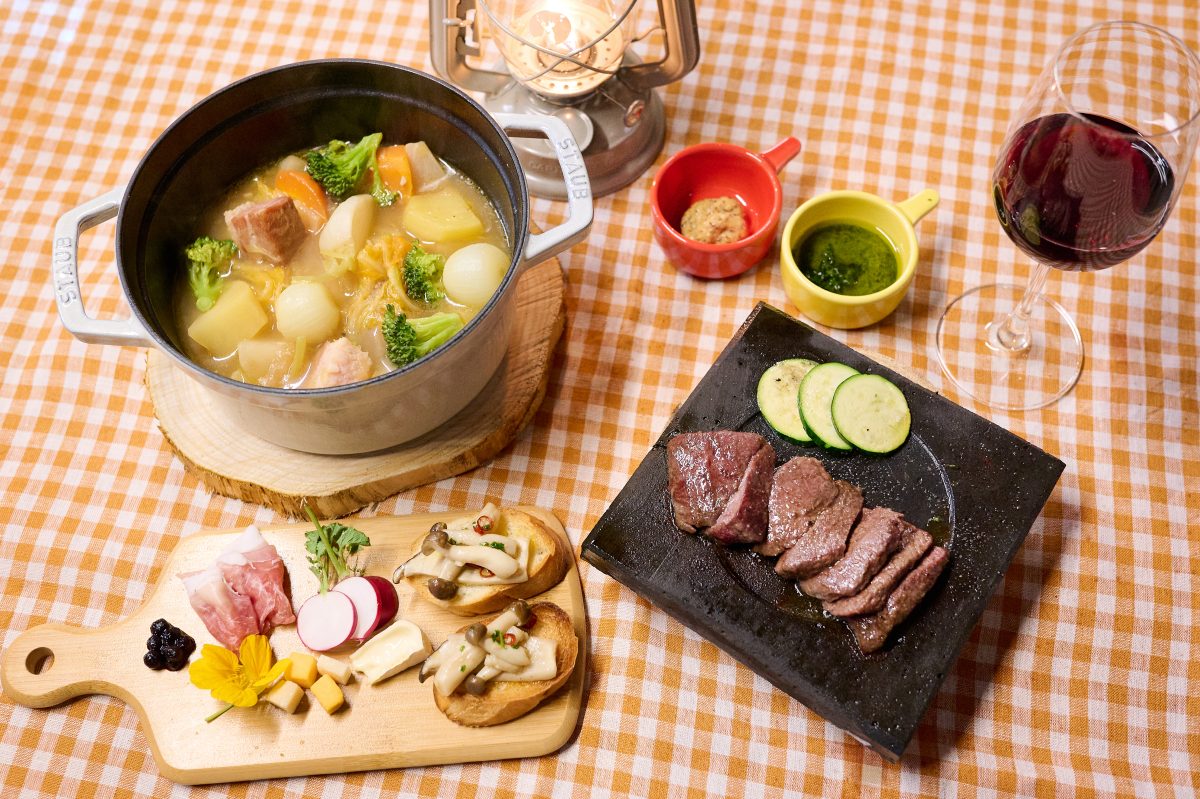 生ハムやチーズなどのアペリティフ、ポトフ、富士山で射止められた鹿の上質なステーキ、リゾット、最後にドルチェ。山梨県産ワインといただきます!(*3)
