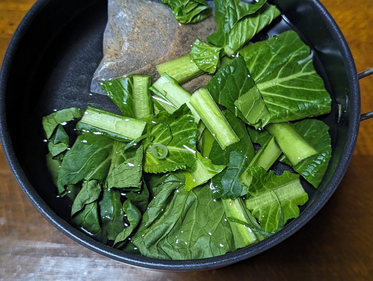 2 茹でる必要がある具材を入れる(小松菜)を入れる。