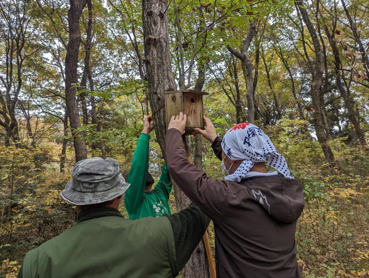 瑞穂町平地林整備活動のリーダー、長谷部さんが「森に小鳥が来てくれたらいいな」と言い始め、昨年、2つの巣箱を取り付けました。