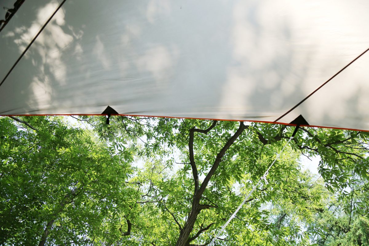 雨水がたまらないようにタープを張るコツは、タープの1ヶ所をロープなどで引っ張って地面に固定すること。そうすることで雨水の逃げ道ができ、水がたまることなくタープを使用できます。