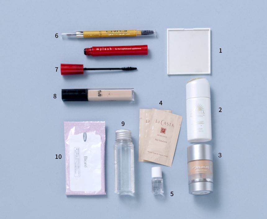 山ではシンプルに日焼け止めのみ。スティックタイプのものをサコッシュのなかに入れておき、こまめに塗り直している。まちではのんびり自然散策するのであれば山と変わらず。レストランに行ったり、市街地を歩いたりする場合はアイブロウやマスカラをプラスしたりと、まち歩きの目的や場所、いっしょに行く人に合わせている。