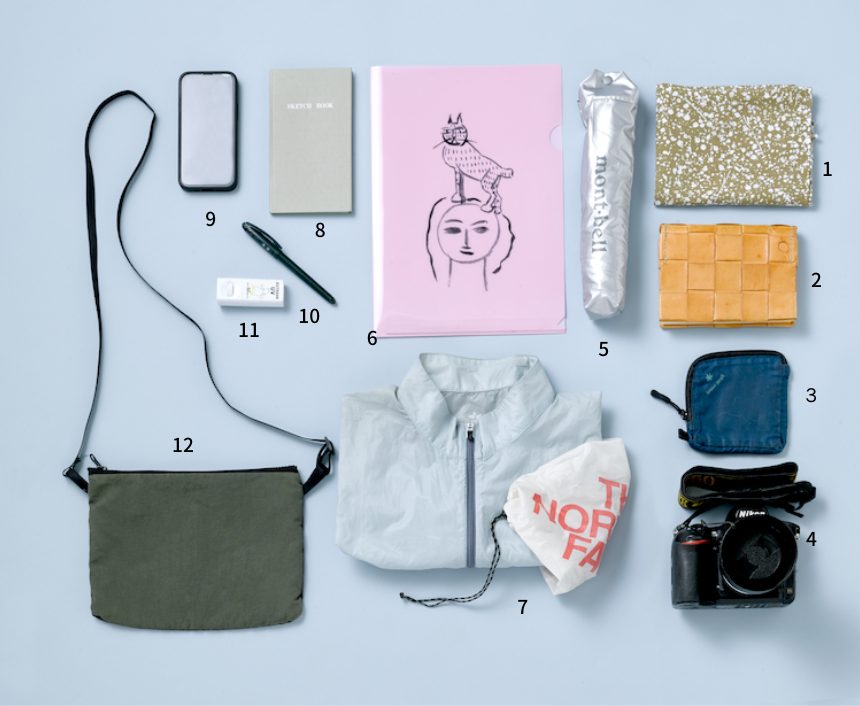 ふもとではおみやげをたくさん購入してもまとめられる、大きめのトートバッグをチョイス。⑧~⑪が入った山でも使用するサコッシュはそのままトートバッグのなかへ。カメラでは植物やまち並みを撮影することが多いという。クラフトデザインテクノロジーのペンは書き心地がなめらかで書きやすいのが◎。