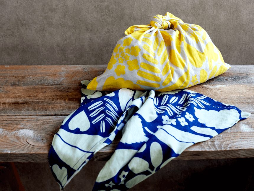ランドネ編集部員の好きな草花をモチーフに、有理さんがデザインしたあずま袋は、着替えを一日ごとに分けたり、宿での温泉までの行き来にタオルなどを入れたりするのに重宝する。2カラーのうち、バックパックの中で目立って、取り出しやすいサンシャインイエローを選ぶことが多いそう。