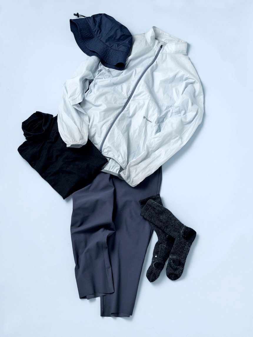 腕に日差しが当たるのが苦手で、夏の低山歩きでも長袖をチョイス。まちでもウインドシェルを持ち歩けば、電車やカフェなど、冷房が少し気になった場合にさらりと羽織れて便利。ゴールドウインのジャケットは、軽量コンパクトかつやわらかい質感でどんなウエアにもなじむのが決め手に。