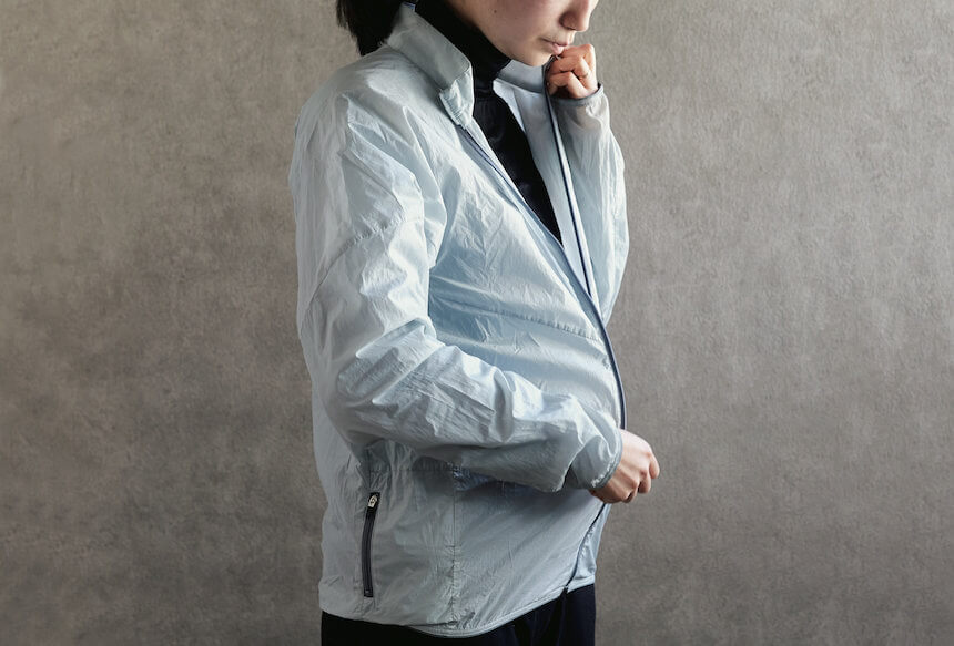 腕に日差しが当たるのが苦手で、夏の低山歩きでも長袖をチョイス。まちでもウインドシェルを持ち歩けば、電車やカフェなど、冷房が少し気になった場合にさらりと羽織れて便利。ゴールドウインのジャケットは、軽量コンパクトかつやわらかい質感でどんなウエアにもなじむのが決め手に。