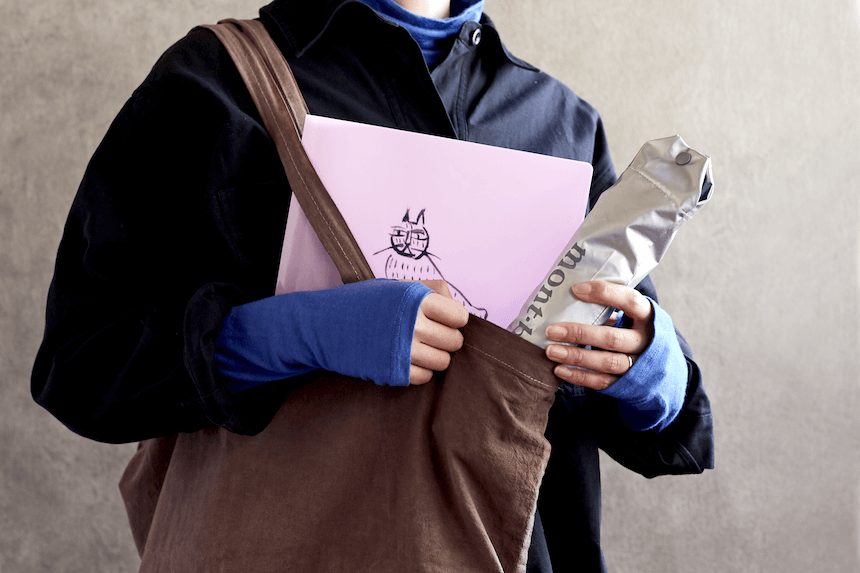 ふもとではおみやげをたくさん購入してもまとめられる、大きめのトートバッグをチョイス。⑧~⑪が入った山でも使用するサコッシュはそのままトートバッグのなかへ。カメラでは植物やまち並みを撮影することが多いという。クラフトデザインテクノロジーのペンは書き心地がなめらかで書きやすいのが◎。