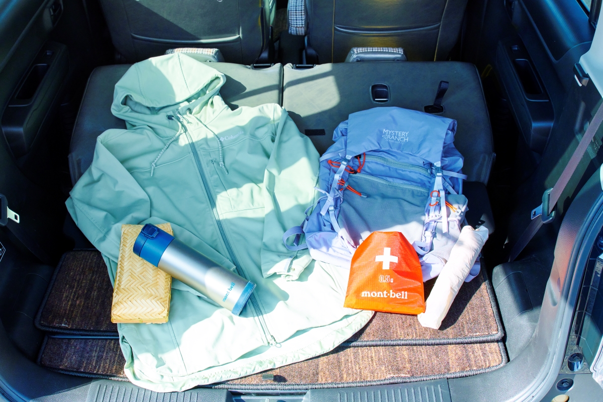 フローラパークソフトシェルジャケット¥16,500(コロンビア/コロンビアスポーツウェアジャパン)、アクアペルファーストエイドバッグ0.5ℓ¥1,595、アルパインサーモボトルアクティブ0.5ℓ¥3,850、トレッキングアンブレラ¥4,950(すべてモンベル/モンベル・カスタマー・サービス)、バックパック:イン&アウト22¥14,300(ミステリーランチ/エイアンドエフ)