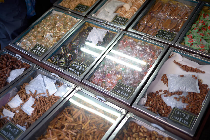 地元の人に愛され続ける和洋菓子や量り売りのおせんべいを、翌日の山歩きの行動食に調達。