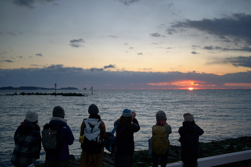 ▲町歩きの最後は、駅から歩いて20分ほどの扇ヶ浜で、海に沈む夕日を眺めて。