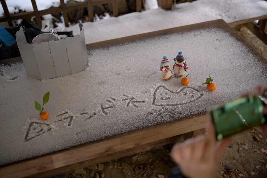 ▲大寒波のあとだったこともあり、登山道には雪の積もる場所も。テーブルに「ランドネ」の文字を書いて記念撮影!