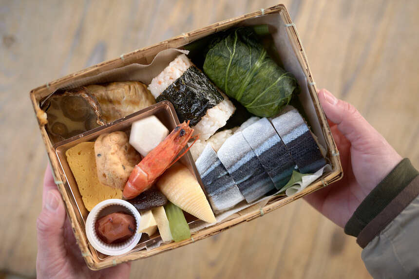▲めはり寿司とサンマ寿司入りのお弁当でランチ。