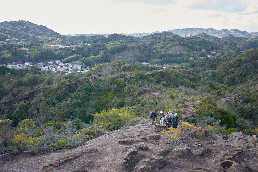海をすぐそばに感じる山であり、ここにしかないドラマチックな展開が待つひき岩群。地殻変動によって傾いた岩が風化浸食され、天を仰ぐヒキガエルのように見えることからその名がつけられた場所。進むごとに次々と見どころが訪れ、田辺を代表する名峰は参加者を驚かせた。