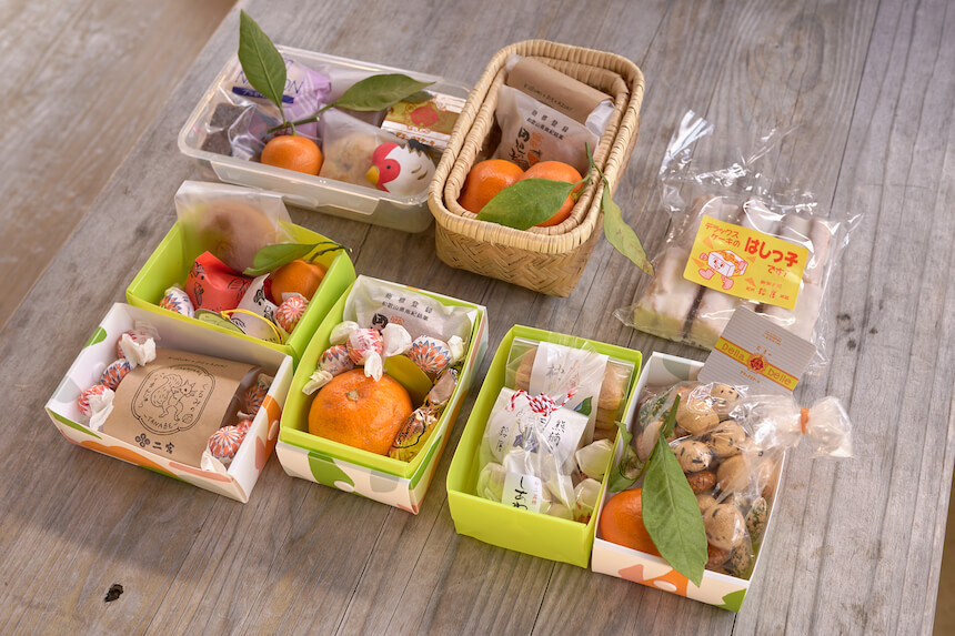 1日目の町歩きで調達したお菓子やミカンを箱に詰めれば、見た目もかわいい自分だけの田辺産おやつセットの完成!