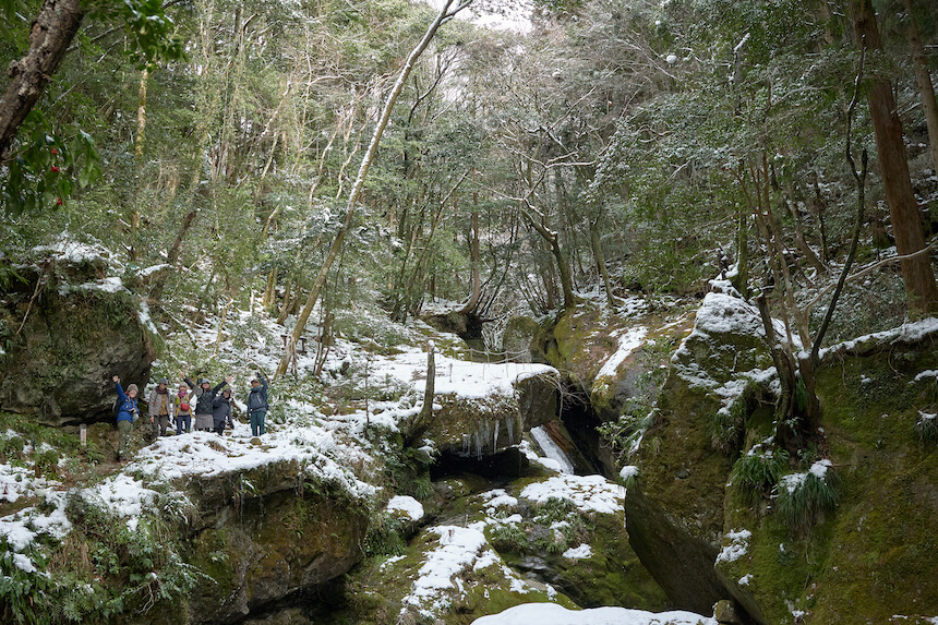 全長約3kmにわたり続く渓谷のあいだをすり抜けていくように続くトレッキングルート。夏でもひんやりとした空気に包まれるこの場所は、田辺の豊かな自然や食を育む水の原点ともいえる。苔むす森のなか、いくつも滝を横目に進めば、ここが「水の国」と呼ばれる所以を感じるはず。