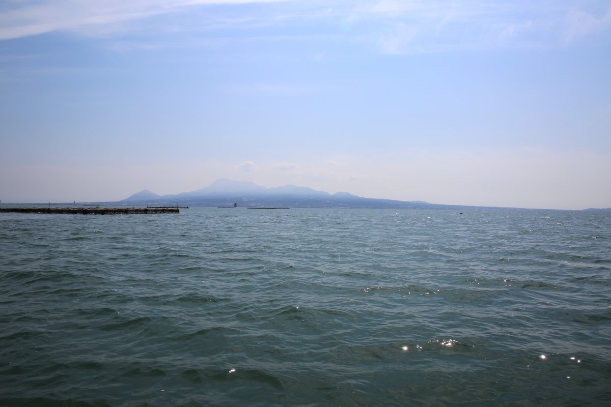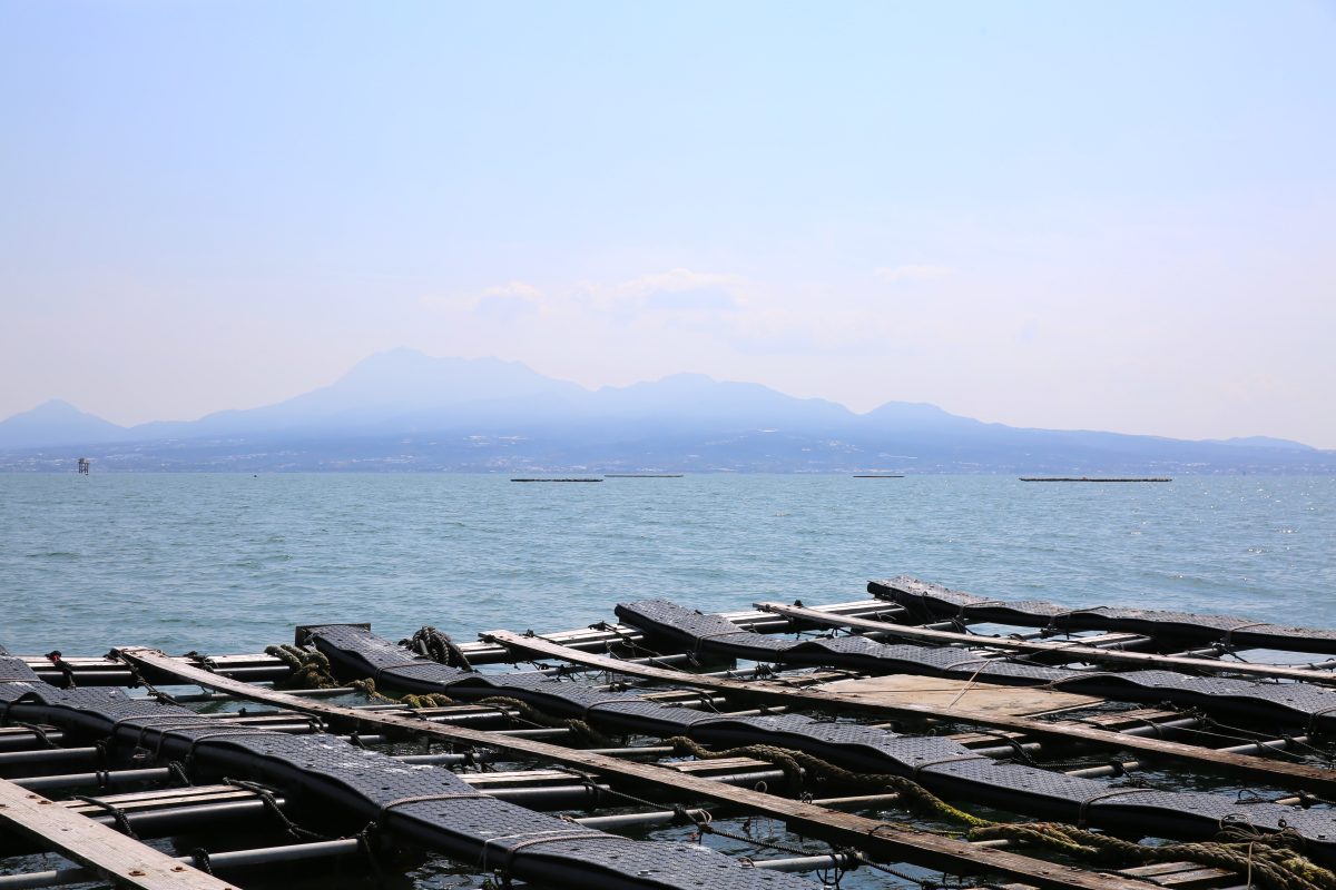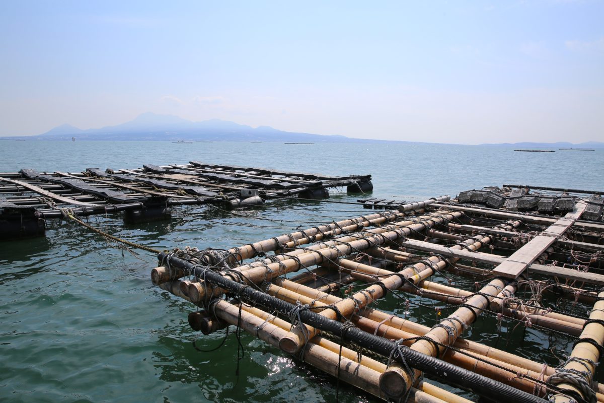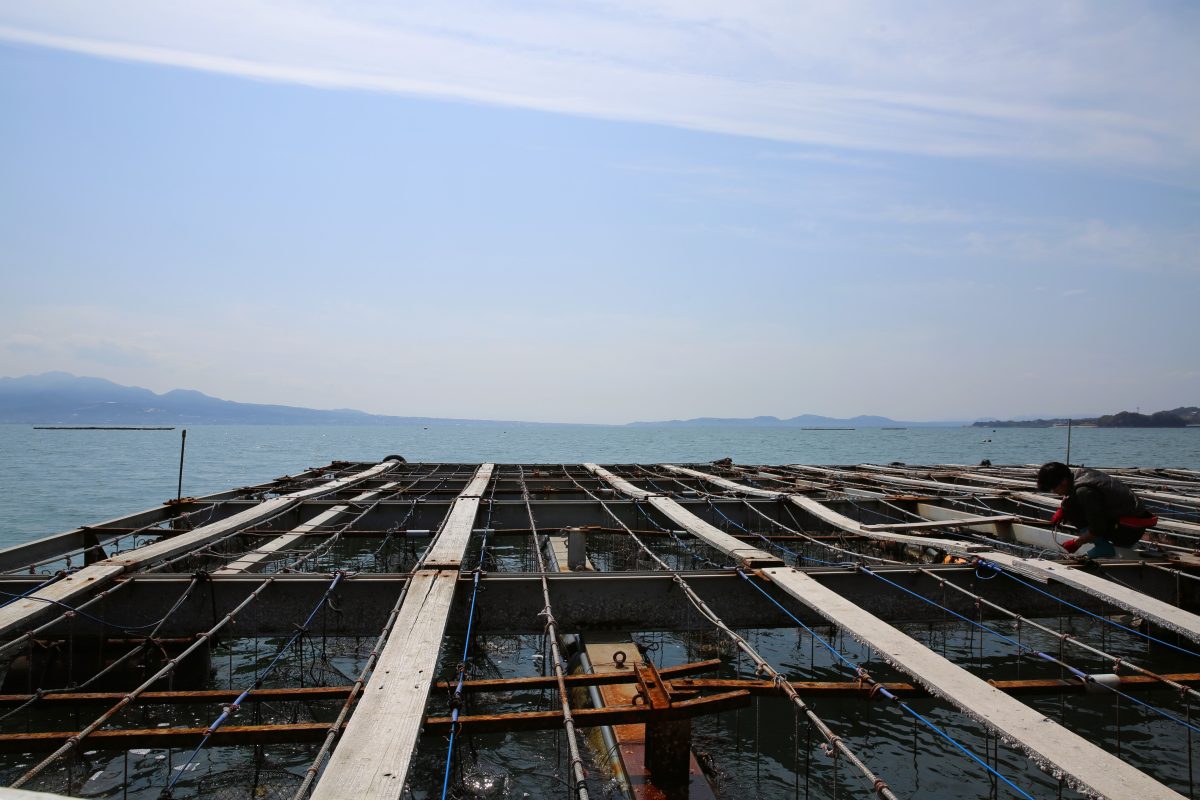 春の有明海のただなかに目を向けると、ぷかぷかとイカダが浮かんでいる。その下にはカゴに入った牡蠣たちが。