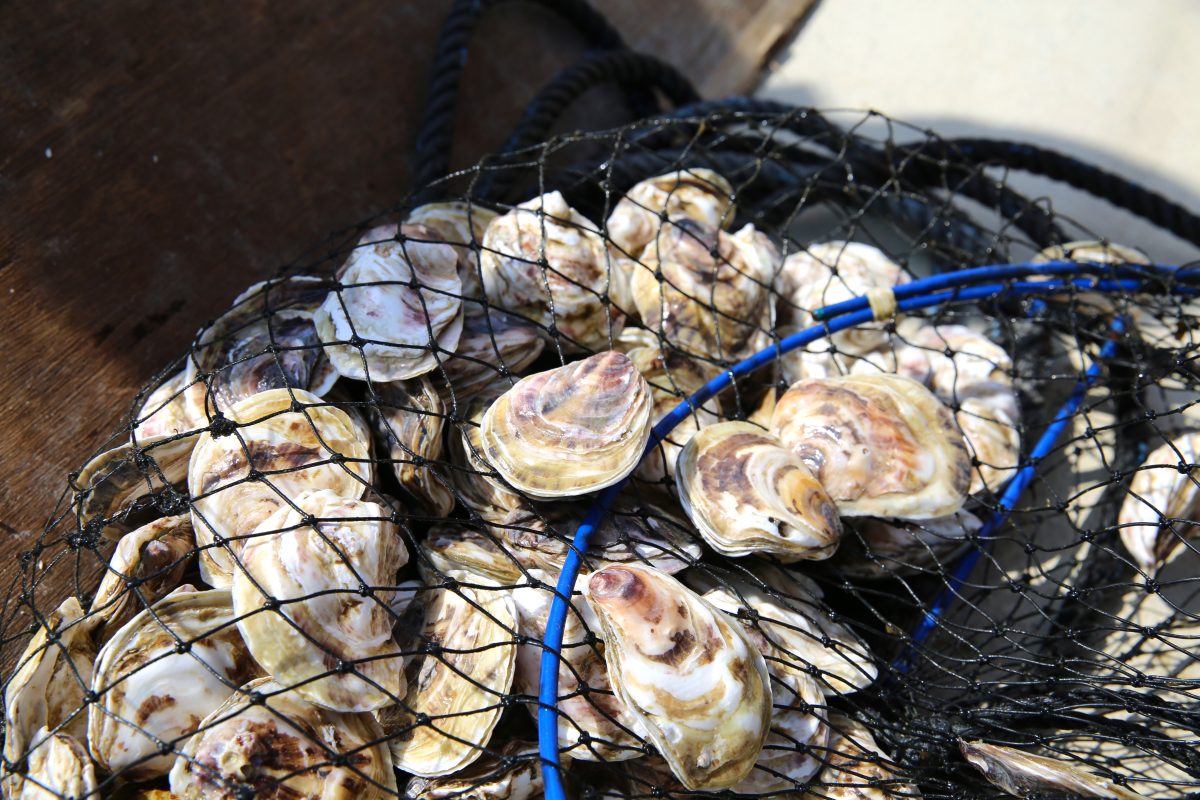 日本では、ホタテの殻に牡蠣の種をつけた物をロープに挟み込み、吊るしておこなうカルチ式という養殖方法が一般的。でも、梅津さんはカゴの中に牡蠣を入れるシングルシード式だ。これは近年日本近海で問題になっている、ナルトビエイという二枚貝を好んで食べるエイの食害から牡蠣を守るため。さらに、このカゴの高さを変えることで牡蠣の味わいや大きさを調整するのだそう。牡蠣は海のなかの深い場所ではエサが食べやすく、殻が大きくなる。でもそれだけだとおいしい牡蠣はできない。