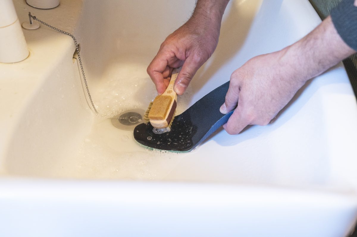 インソールは軽い力でブラッシングして砂ぼこりを落とす。ニオイや汚れが気になるなら洗面台で洗うかお風呂に入ったついでに洗っておく。