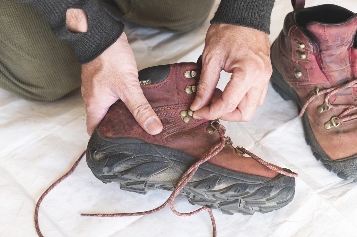 ヒモをゆるめながら、ヒモが切れそうではないか、つま先やアウトソール、シューレースバックルが剥がれかけていないか、アウトソールの溝が削れていないか、ベロやアッパーが破れていないかを見る。