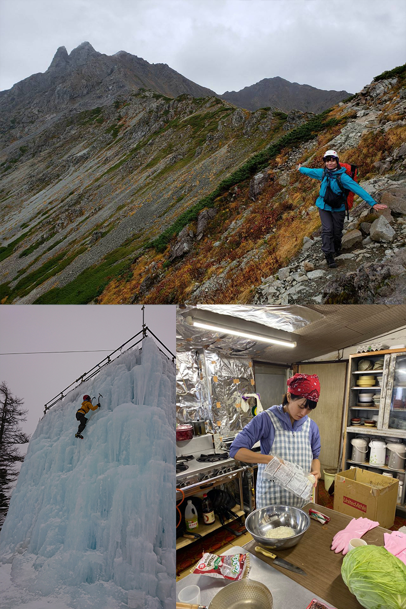 「2 泊3 日の北アルプス縦走は出会いあり、再会あり、絶景ありで最高でした(上)! 尾瀬の山小屋でアルバイトも経験。みんなも尾瀬、いこおぜ~! ( 下右) 初体験のアイスクライミング! 氷のすごさにこおりゃ、参った!(下左)です」