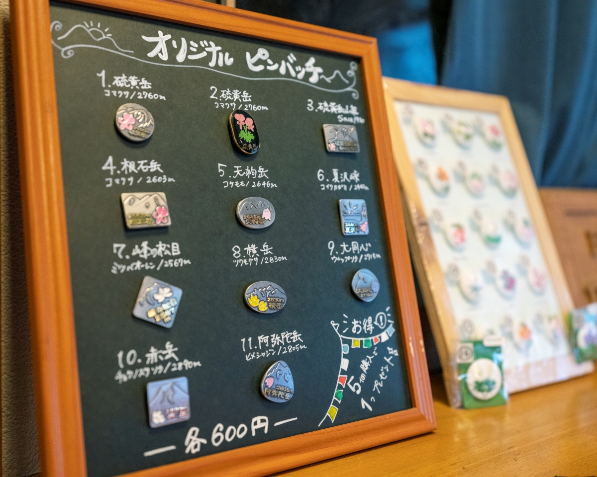 ピンバッチや手ぬぐいなど、売店で購入可能な山小屋オリジナルグッズにも力を入れている。ピンバッチはなんと11種類ものバリエーションがあり、どれを選ぶか悩んでしまうはず。